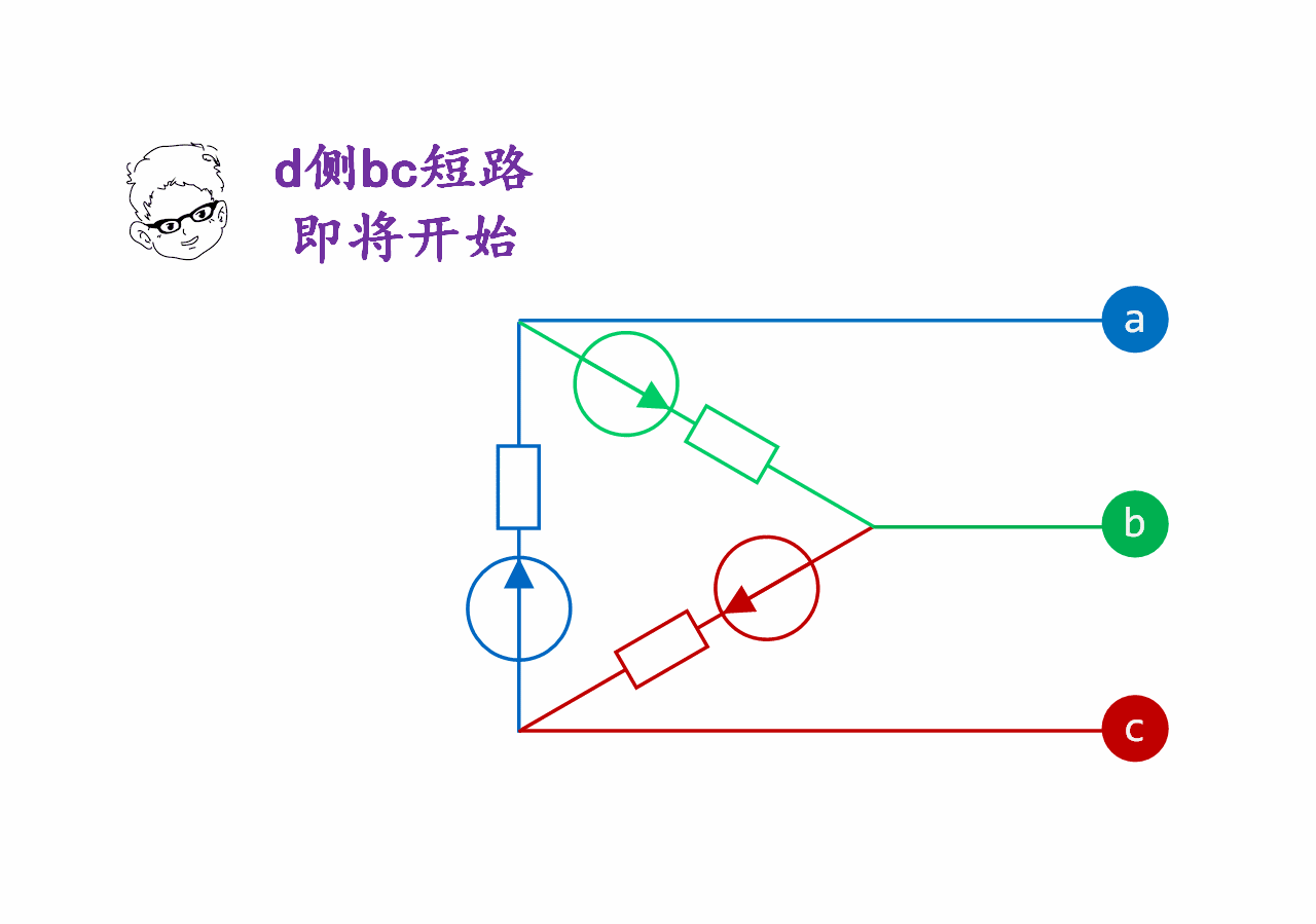 先分析三角連接的xyz電源發(fā)生bc短路:因a相沒(méi)有短路,故Ia為零,x繞組(藍色)和y繞組(綠色)電源串聯(lián),等效電勢為-(Ex + Ey) = Ez,等效阻抗為2倍系統阻抗,故z繞組(紅色)電源提供的短路電流是xy串聯(lián)繞組電流的2倍,如下面動(dòng)態(tài)圖所示(時(shí)長(cháng)15秒):