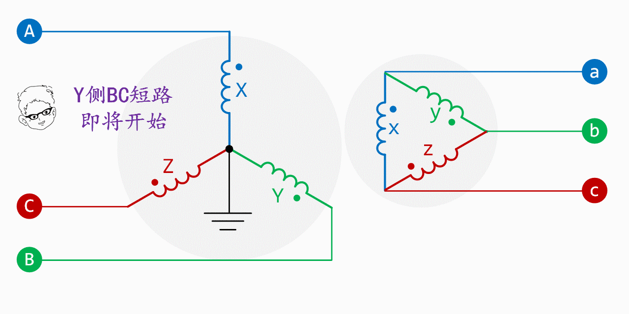 電源在d側,Y側發(fā)生BC短路時(shí),短路點(diǎn)—Z繞組—Y繞組形成回路有短路電流,而X繞組無(wú)電流。繪制出d側繞組電流和abc相電流,如下面動(dòng)態(tài)圖所示: