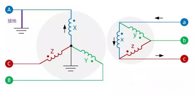 Y/d-11變壓器的繞組連接如下圖所示: